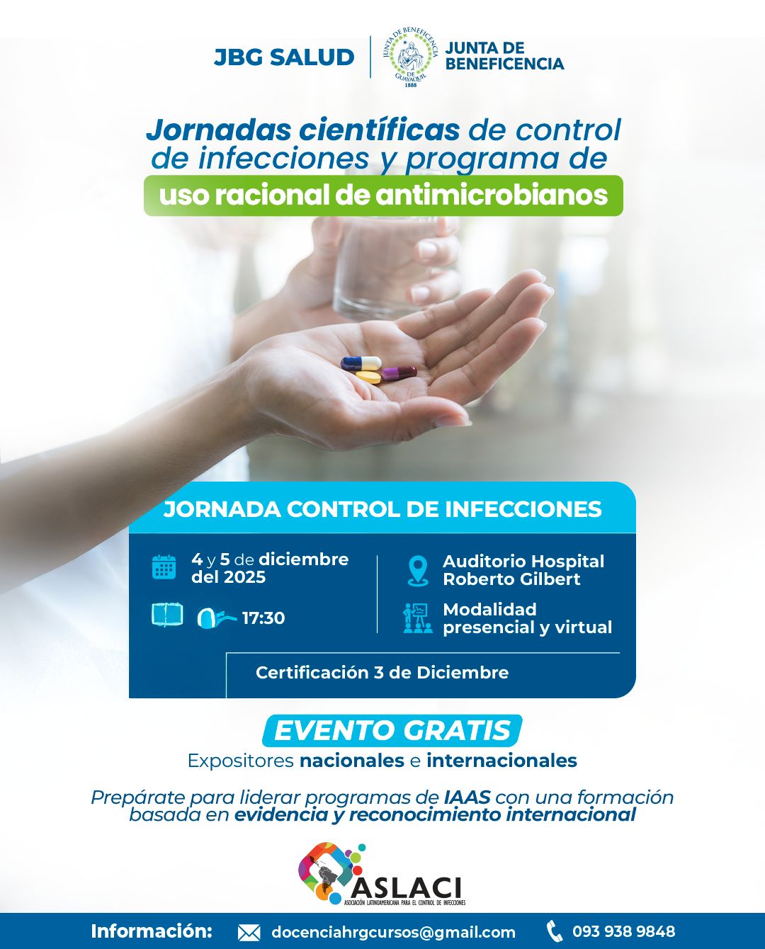 Eventos Jornadas Cientificas de control de IAAS y PROA. julio 20, 2025 Aslaci 4 y 5 de diciembre. Guayaquil- Ecuador Entradas relacionadas Eventos Webinar – Implementación de Bundles para la prevención de infecciones asociadas a dispositivos adaptado al contexto latinoamericano agosto 11, 2025agosto 28, 2025 Aslaci Cursos Eventos Webinar ASLACI Febrero 2025 enero 30, 2025septiembre 5, 2025 Aslaci